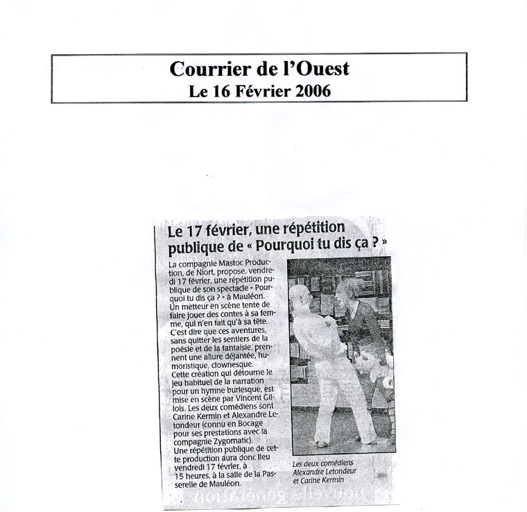 Le 10.12.2006 – Saint Hilaire la Pallud (79) – Le 18.10.2006 – St Martin du Fouilloux (79) – Le 26.04.2005 Moulin du Roc – Niort (79) – Du 16 au 18.03.2005 Cap Sud – Poitiers (86)