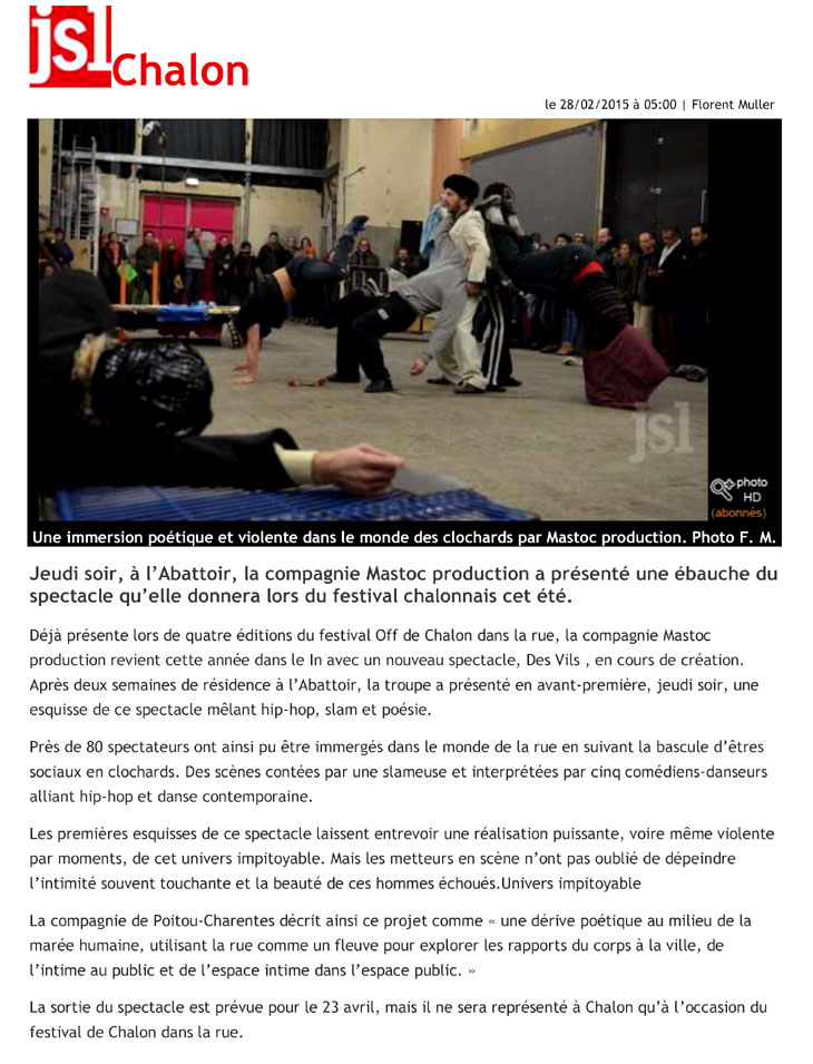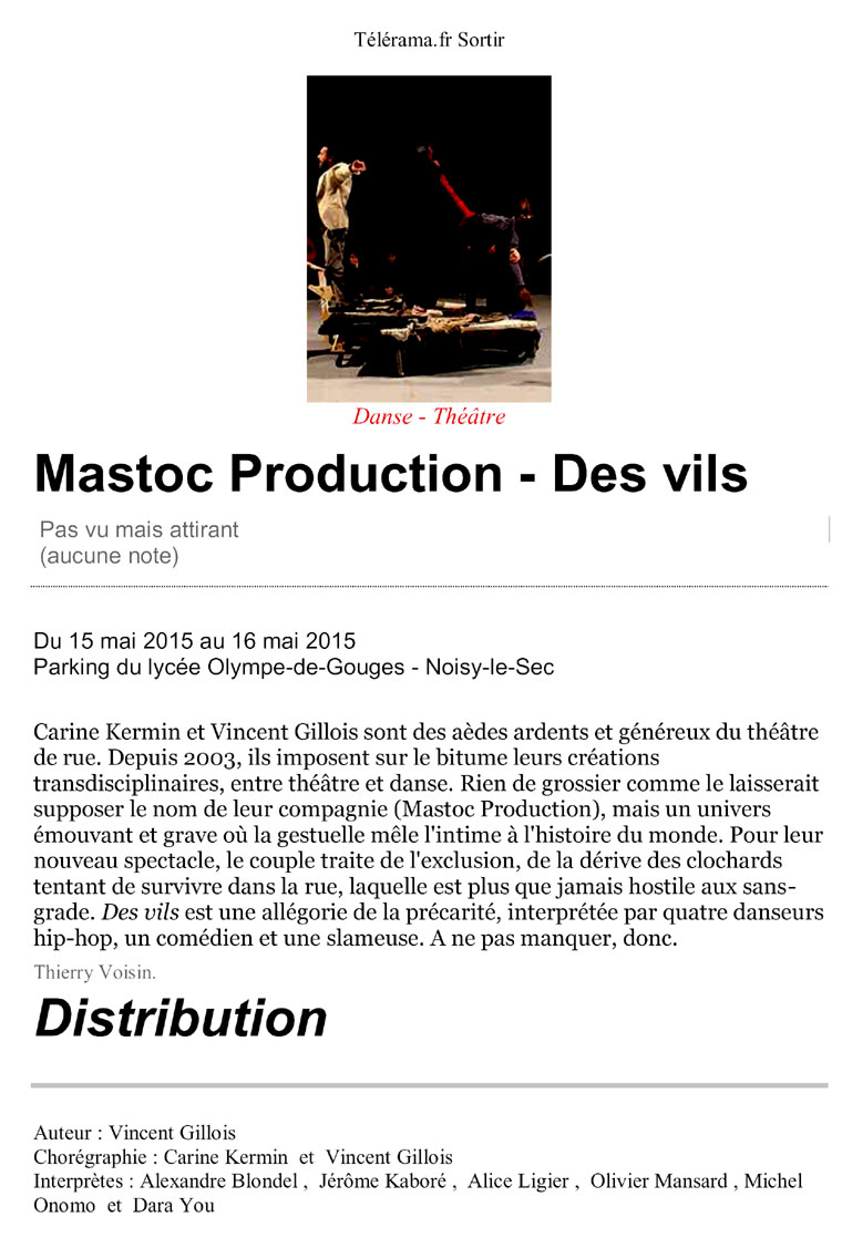 Un spectacle qui traite de la clochardisation, de l’échouement et de la beauté des hommes. Des Vils est une dérive poétique au milieu de la marée humaine et utilise la rue comme un fleuve. Il met en scène 5 danseurs/comédiens, 1 slameuse et leurs mondes transportés dans des « caddies », radeaux des exclus.