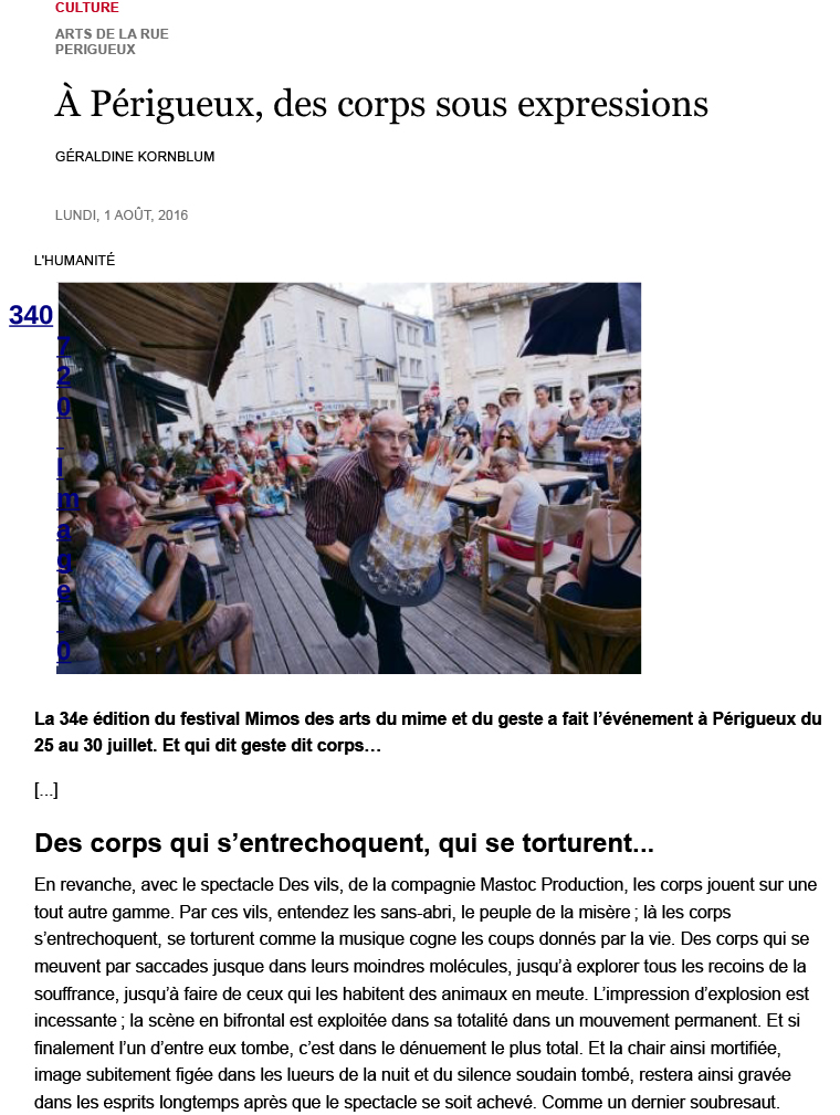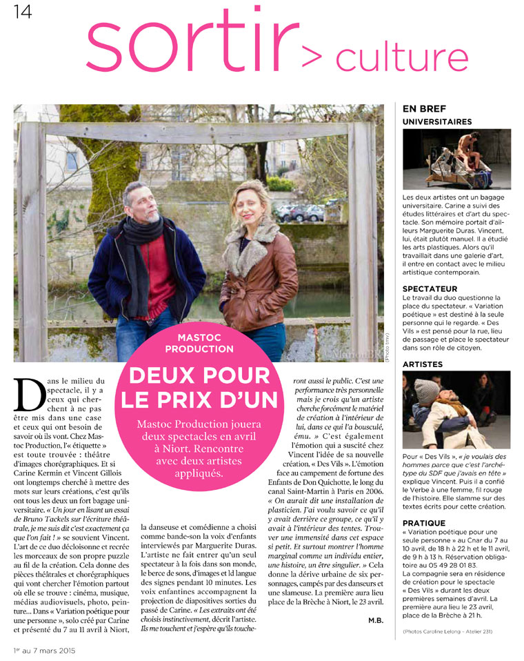 Le 29.07.2016 Festival Mimos, Périgueux (24) – Le 27.07.2016 Sortie de reprise à Melle (79) – Du 23 au 25.07.2015 Festival Chalon dans la rue, l’Abattoir, CNAR de Chalon sur Saône (71) – Les 15 et 16.05.2015 Les Rencontres d’Ici et d’Ailleurs, le Moulin Fondu, CNAR de Noisy-le-Sec(93) – Le 23.04.2015 PREMIERE à Niort (79) avec les Usines Boinot, CNAR de Niort (79) – Du 13 au 24.04.2015 Résidence de création aux Usines Boinot, CNAR de Niort (79) – Du 16 au 20.03.2015 Résidence de création au Boulon, CNAR de Vieux-Condé (59) – Du 16 au 27.02.2015 Résidence de création à l’Abattoir, CNAR de Chalon-sur-Saône (71) – Du 12 au 23.01.2015 Résidence de création l’Atelier 231 – Sotteville-lès-Rouen (76) – Du 03 au 07.11.2014 Résidence de création au Centre Chorégraphique National – La Rochelle (17) – Du 06 au 10.10.2014 Résidence d’écriture au Moulin Fondu CNAR – Noisy-le-Sec (93) – Le 18.11.2013 Rencontres à l’Ouest – Vendôme (41) – Présentation de projet