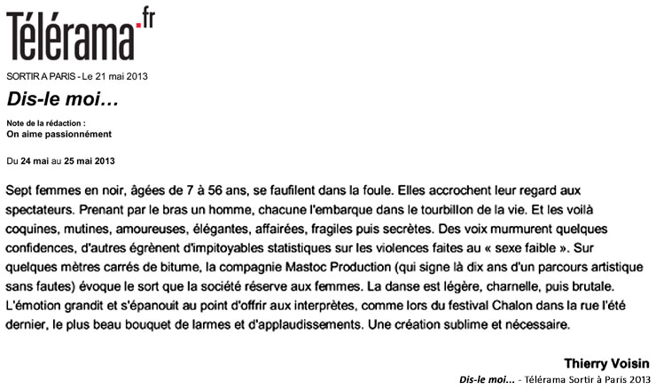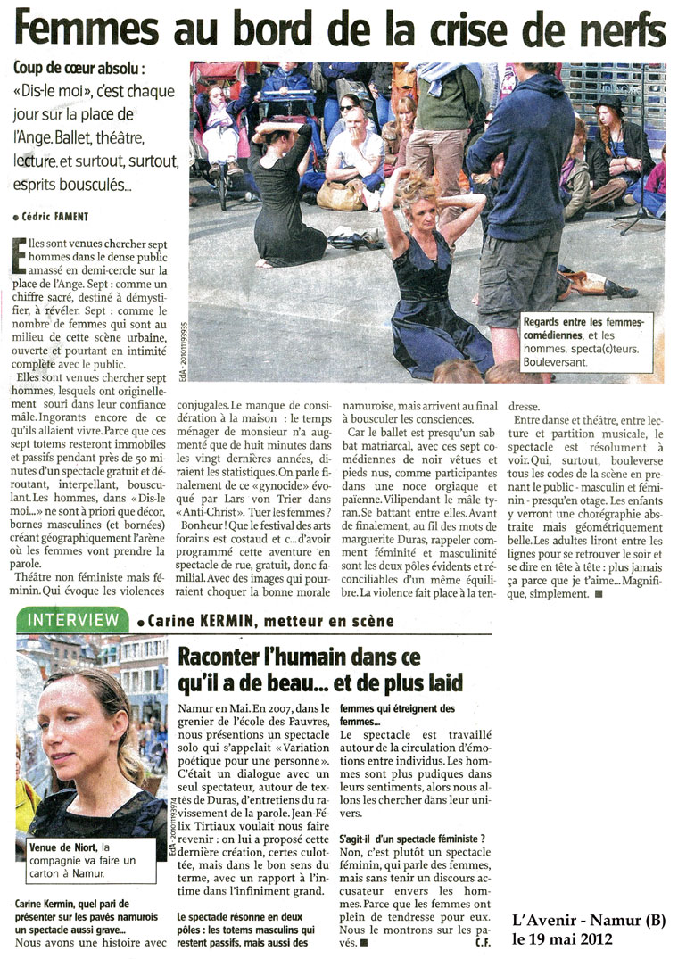 Dis-le moi… reçoit le prix du public de l’édition 2012 du Festival Namur en mai (B) dans la catégorie spectacles de rue.