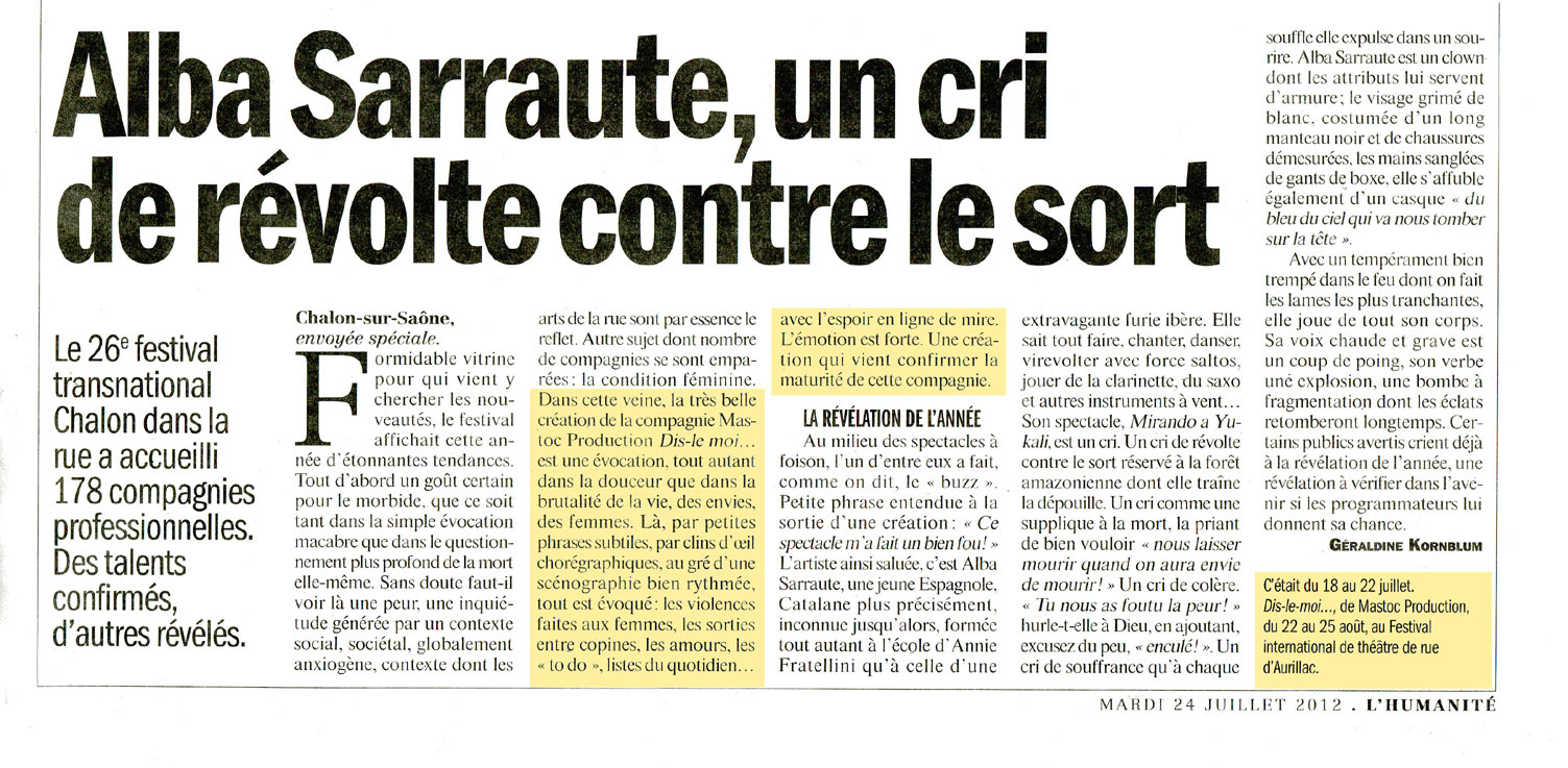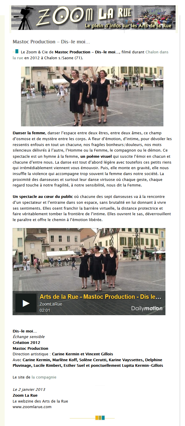 Les 27 & 28.09.2014 Festival Les Arts dans la rue, Châtillon (92) – Le 14.09.2014 Festival Jours de Fête, l’Onyx de St Herblain (44) – Le 06.09.2014 Urban Moves International Dance Festival, Manchester (GBR) – Le 14.08.2014 les Jeudis du Port, Le Fourneau de Brest (29) – Le 10.08.2014 Festival Theater op de Markt de Hasselt (Bel) – Les 02 et 03.08.2014 Les Z’Estivales du Havre (76) – Le 31.07.2014 Caen Soirs d’Eté (14) – Du 24 au 27.07.2014 Festival MiramirO de Gand (Bel) – Les 05 & 06.07.2014 Festival RenaissanceS de Bar-le-Duc (55) – Le 03.07.2014Festival Dièse# de Dijon (21) – Les 20 & 21.06.2014 Festival Les Invites de Villeurbanne (69) – Le 14.06.2014 Festival Furies de Châlons-en-Champagne(51) – Les 07 et 08.06.2014 Festival Parade(S) de Nanterre (92) – Le 01.05.2014 Le 1er Mai du Familistère de Guise (02) – Les 11 et 12.04.2014 Quartier de lune – L’Abattoir de Chalon-sur-Saône (71) – Le 07.03.2014 La Palène – Rouillac (16) – Le 06.10.2013 Festival des Vendanges – Suresnes (92) – Le 21.09.2013 Le Nouveau Relax – Chaumont(52) – Les 09 et 10.08.2013 Festival Fest’Arts – Libourne(33) – Les 07 et 08.08.2013 Festival Les Fondus du Macadam – Thonon-les-Bains(74) – Le 31.07.2013 Festival Mimos – Périgueux (24) – Le 20.07.2013 Festival Résonances – Rochefort (17) – Le 14.07.2013 Festival Terre de Danses – Nueil-les-Aubiers (79) – Les 29 et 30.06.2013 Festival Viva Cité – Atelier 231 – Sotteville-lès-Rouen(76) – Du 21 au 23.06.2013 Festival International Mirabilia (It) – Les 24 et 25.05.2013 Les Rencontres d’Ici et d’Ailleurs – Cie Oposito – Noisy-le-Sec(93) Les 04 et 05.05.2013 – Festival Les Turbulentes – Le Boulon – Vieux-Condé(59) – Les 08 et 09.09.2012 Festival Coup de Chauffe – Cognac(16) – Du 22 au 25.08.2012 Festival International de théâtre de rue d’Aurillac – Cour Doumer, Collectif où le temps s’arrête – Aurillac (15) – Du 18 au 21.07.2012 Festival “Chalon dans la rue” en off – Chalon-sur-Saône (71) – Du 17 au 20.05.2012 Festival “Namur en Mai” en Cie Invitée – Prix du public – Namur (Bel) – Le 10.03.2012 PREMIERE – Avec les Usines Boinot, CNAR en Poitou-Charentes – Niort (79) et Impulsions Femmes – Niort (79)- Festival “Impulsions” – Place du Marché de Niort (79) – Le 08.03.2012 Avant-Première – Journée de la Femme – Centre Chorégraphique National de La Rochelle (17)