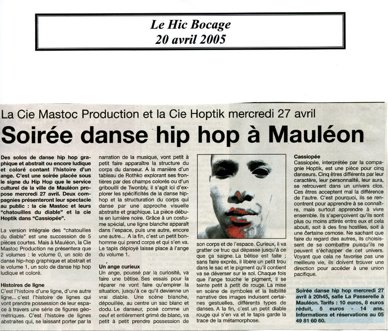 Le 27.11.2005 Ecole de danse – Villejuif (94) – Le 22.07.2005 Mines en scène – Mines d’argent de Melle (79) – Le 27.04.2005 La Passerelle – Mauléon (79)