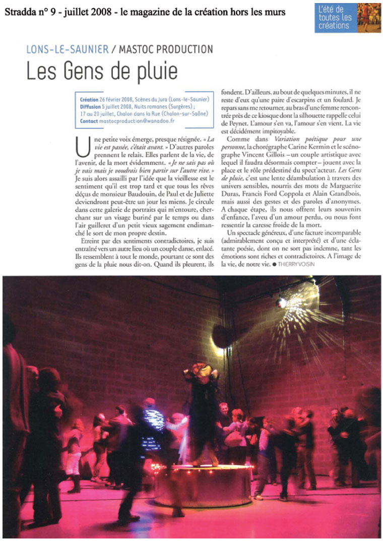 Les gens de pluie propose une déambulation sensible, onirique à travers quatre univers. Chacun de ces univers aborde une thématique, décelée aux fil d’entretiens avec les personnes âgées. Depuis deux ans, nous travaillons autour de la parole, du témoignage des anciens du village, qui nous dévoilent leurs rêves perdus, leur première rencontre, la vie sous l’occupation. C’est à travers les mots de Duras, la voix des anciens, des photos des gestes, que des personnages hors du temps, nostalgiques parfois, vous font sentir le frisson de la rencontre, l’effroi de la guerre, l’ivresse, l’amour.