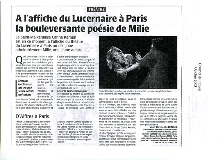 Milie, témoignage théâtral et chorégraphié associe sur scène l’histoire vraie d’une enfant autiste, des aspects scientifiques, une psychologue (l’auteur et l’adaptateur du livre Milie enfant à naître) et des interprètes comédiens danseurs.