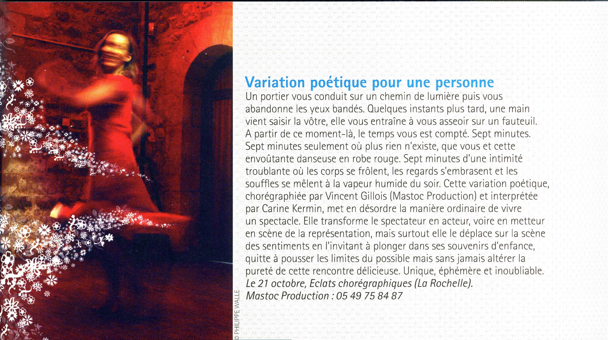 Du 07 au 11.05.2015 Usines Boinot – CNAR de Niort (79) – Les 25 et 26.01.2013 Les 10 ans de la Cie – La Mothe St Héray (79) – Les 15 et 16.09.2012 Fêtes du Patrimoine – Ancien Hôpital de Saint-Martin-en-Ré(17)- Communauté de Communes de l’Ile de Ré – Le 03.09.2011 Ouverture de la saison culturelle du Théâtre Comoedia – Aubagne (13) – Les 26, 27 & 28.11.2010 Festival “Le Léz’Arts à roulettes” – Blénod lès Pont à Mousson (54) – Les 14 & 15.11.2009 Festival “Convergences” – Charny sur Meuse (55) – Les 27 & 28.06.2009 Festival Les Sarabandes – St Genis d’Hiersac (16) – Les 13 et 14.09.2008 Festival « jours de fête » – Saint Herblain (44) – Les 23 et 24.05.2008 Festival « les siacreries » – Carros (06) – Le 18.05.2008 Festival le « printemps des Rues » – Espace Jemmapes – Paris (75) – Les 28 et 29.03.2008 Festival « Déchaîné » Maison Paroissiale – Chênée (B) – Le 07.10.2007 Festival des Vendanges Ecole Wilson -Suresnes (92) – Le 28.07.2007 Festival « Boulevard du Jazz » – Cinéma le Melies -Melle (79) – Du 19 au 22.07.2007 Festival « Chalon dans la Rue » – Piccolo Théâtre – Chalon/Saône (71) – Les 14 et 15.07.2007 Journées du Domaine d’Harcourt Atelier 231 Harcourt (76) – Du 05 au 07.07.2007 Les Pronomades salle des fêtes Larcan (31) – Les 28 et 29.06.2007 Festival de Trop Espace Beaujon Paris (75) – Les 26 et 27.05.2007 Festival « Demandez-nous la lune ! » – Meisenthal (57) – Du 17 au 20.05.2007 Festival « Namur en Mai » – Escholle des pauvres – Namur (B) – Le 29.04.2007 Journée Mondiale de la danse – Parthenay (79) – Le 27.04.2007 Festival « Sonnette à son Pied » – Poitiers (86) – Les 20 et 21.04.2007 Festival Danse Côté Jardin Théâtre de Lorient (56) – Le 18.11.2006 Graines de Rue – Bessines (87) – Les 21 et 23.10.2006 Les Eclats Chorégraphiques Maison Henri IV – La Rochelle (17) – Du 18 au 22.09.2006 Scènes du Jura – Théâtre à l’Italienne de Lons le Saunier (39) – Le 16.09.2006 Fête à l’Orangerie Pavillon de l’orangerie La Mothe-St-Heray (79) – Du 16 au 19.08.2006 Festival d’Aurillac – Maison renaissance Aurillac (15) – Du 12 au 14.08.2006 Festival « Le Nombril du Monde » – Lavoir – Pougne Hérisson (79) – Le 08.07.2006 Festival au Village – Mairie Brioux sur Boutonne (79) – Le 22.01.2006 Festival « Les Salés Sucrés » – la Griotte de Cerizay (79) – Le 19.01.2006 Représentations professionnelles – Foyer Rural la Mothe-St-Heray (79) – Le 12.01.2006 Représentations professionnelles – Foyer Rural la Mothe-St-Heray (79) – Le 19.07.2005 Représentations professionnelles – Foyer rural la Mothe-St-Heray (79) – Le 19.06.2005 Festival Les Voix de la Terre – Chapelle du musée de Bougon (79)